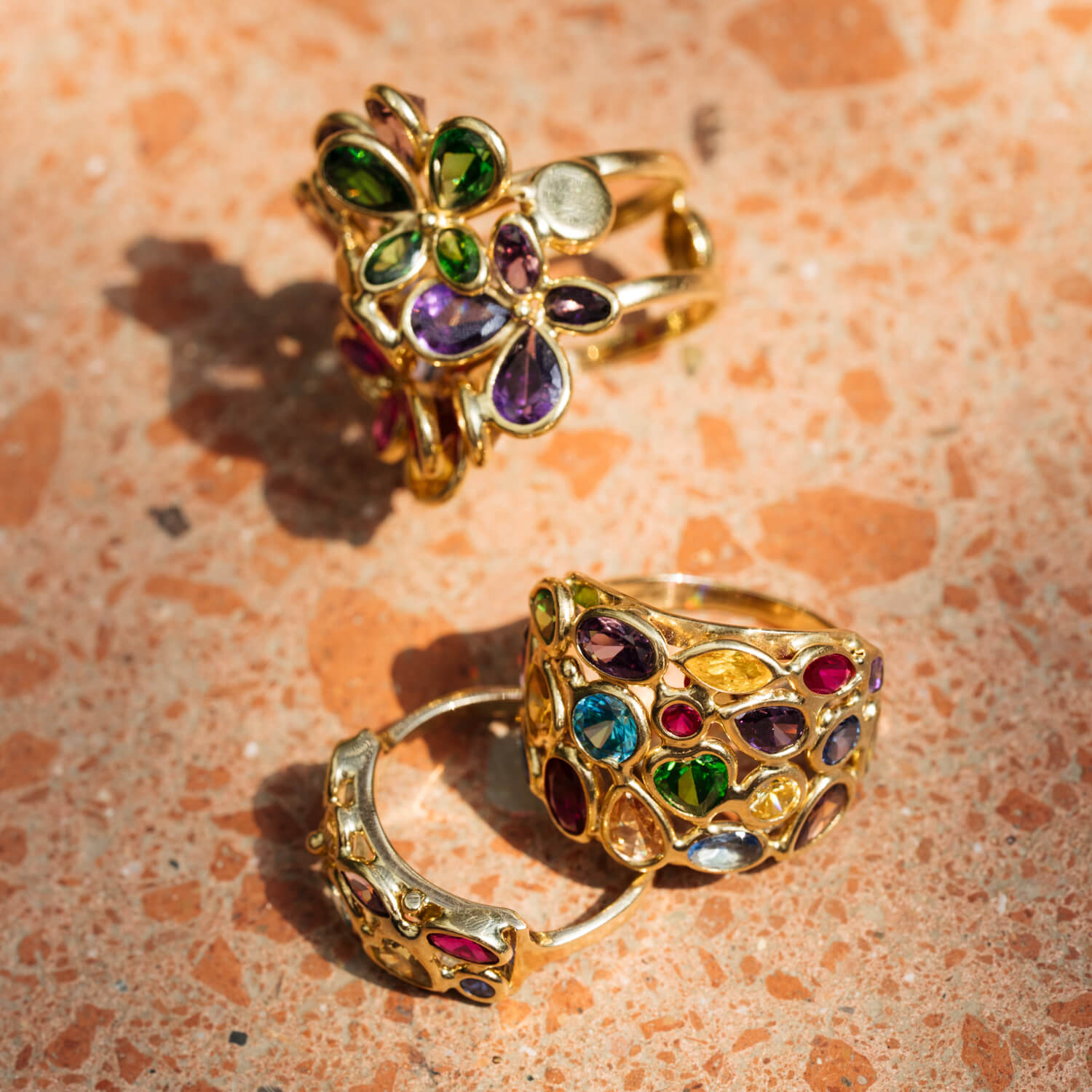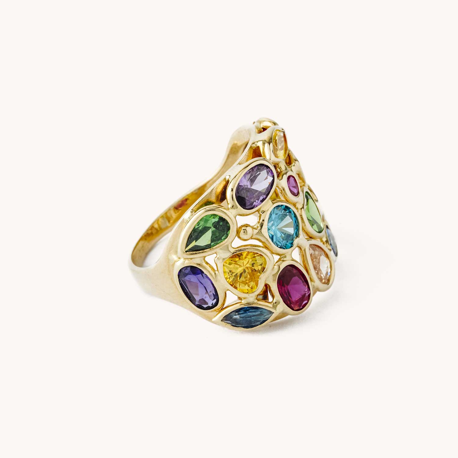 A bold silhouette, inspired by Italian artistry. The Mosaic Dome Ring features a vibrant array of semi-precious stones set in a sculptural 18k gold dome. Designed to mimic the intricate glasswork of Italian church windows, each stone is carefully placed to create a colorful, light-catching mosaic effect. Lush, architectural, and completely one of a kind — a statement of color, craft, and cultural heritage.