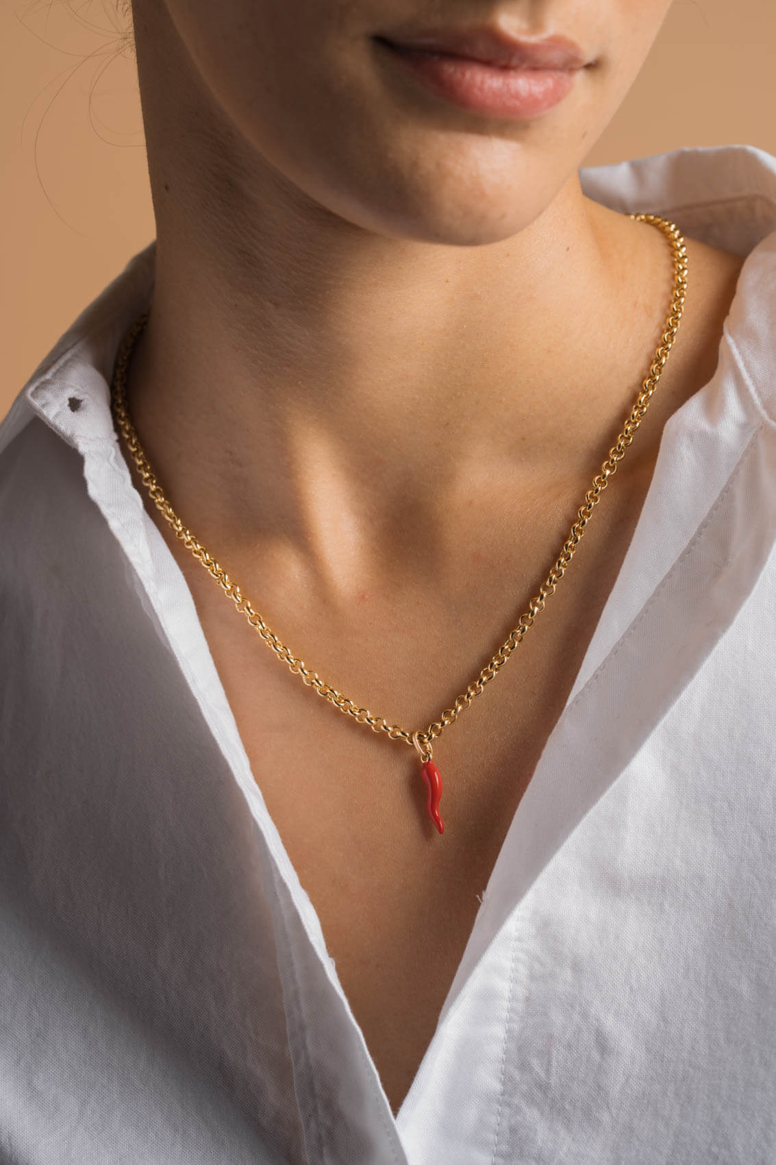 A symbol of protection and good fortune, the Red Italian Horn Pendant is crafted in solid 18k gold and finished with glossy red enamel. Rooted in Italian tradition, it’s worn as a talisman to ward off negativity and invite luck.